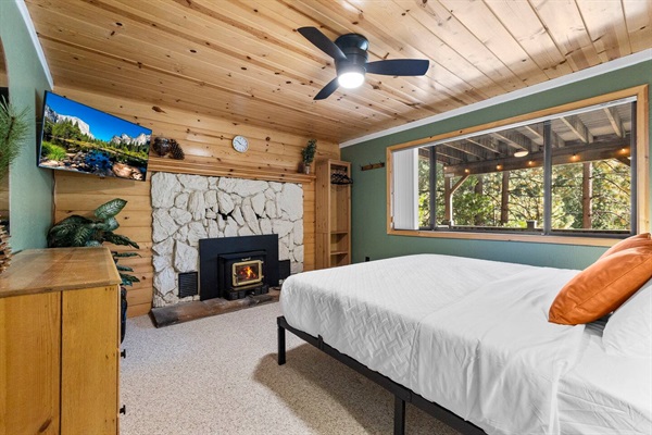 California King bed, rollaway bed (stored in closet), 2 full closets, and a workspace.